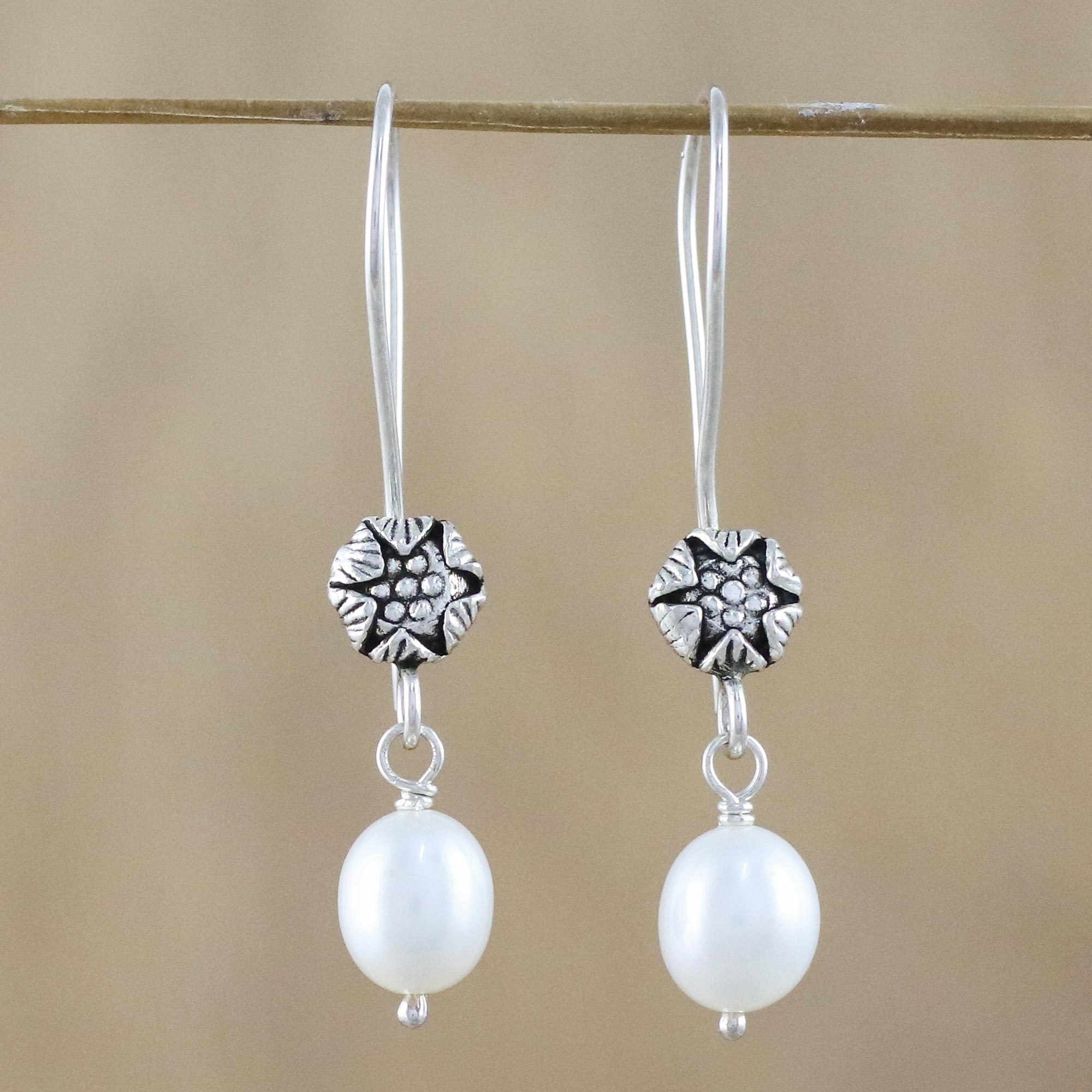 White Cultured Pearl Flower Dangle Earrings, 'Emerging Buds'