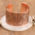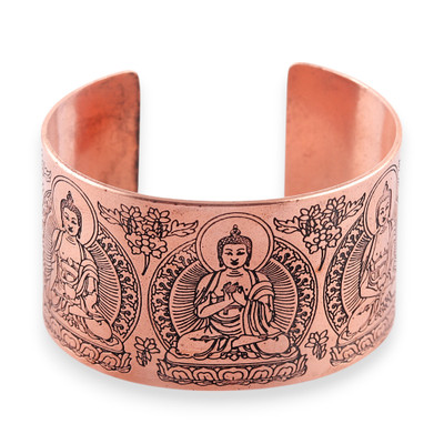 Embrace inner peace and timeless artistry with this wide copper cuff bracelet adorned with intricately engraved Buddha motifs. Created by India's Sumit Dhawan, it blends spiritual symbolism, traditional etching and handcrafted design, making it the ideal accessory for mindfulness lovers, yoga practitioners or anyone who appreciates Eastern spirituality.