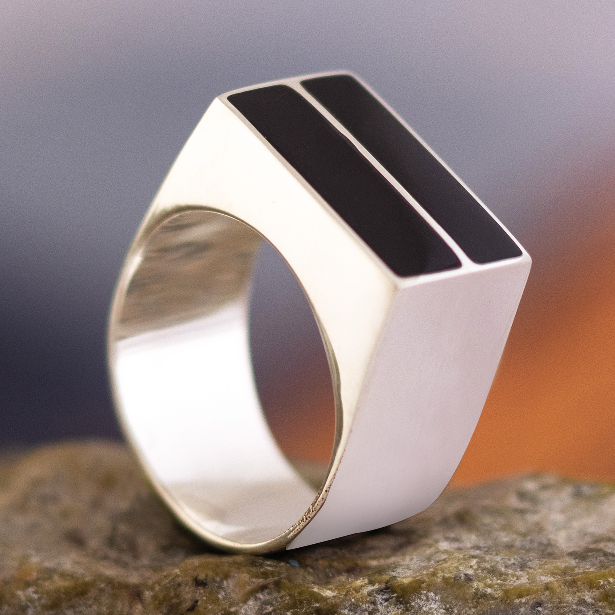 Wide Sterling Ring with Obsidian, 'Symmetry'