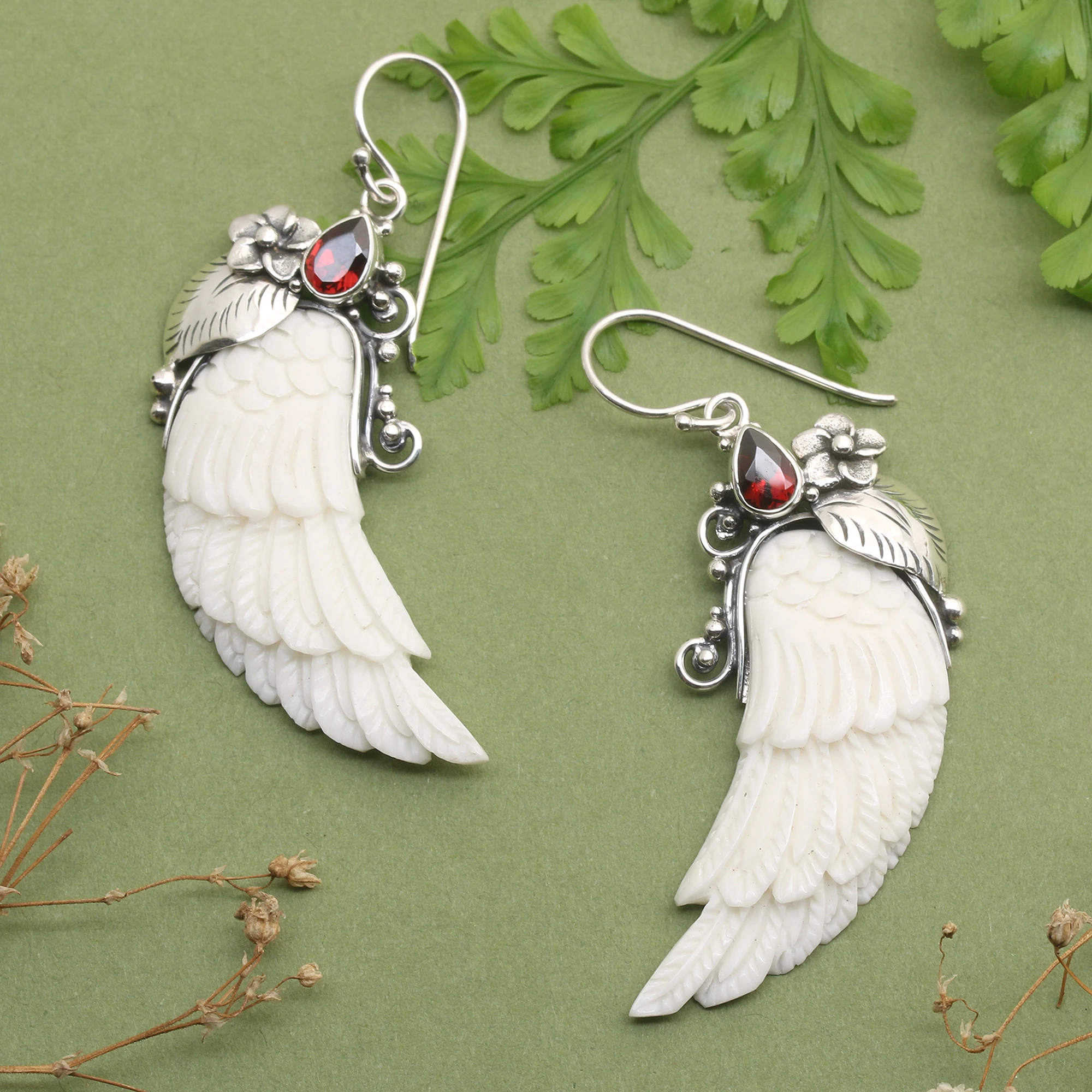 Classic regional details add an ethereal and magical accent to these dangle earrings from the paradisial Balinese lands. Artisan Ayu Ary combines her long expertise with enchanting talent in this glorious design, whose wing-shaped bone motifs add an ethereal ivory tone to the pieces. Accented with sterling silver, the earrings also feature natural garnet jewels as a symbol of passion and romance.