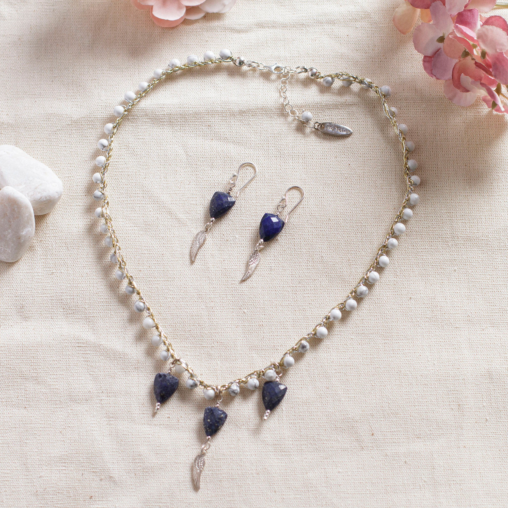 Mexican artisan Alejandra Torres combines precious materials to create a stunning jewelry set in honor of magic and freedom. Made from sterling silver, the set includes a necklace ornamented with silver and golden polyester threads, lapis lazuli and agate beads, while the earrings—in a polished finish—feature gorgeous lapis lazuli jewels. Each piece has wing pendants dancing gracefully at the bottom, symbolizing spirituality.