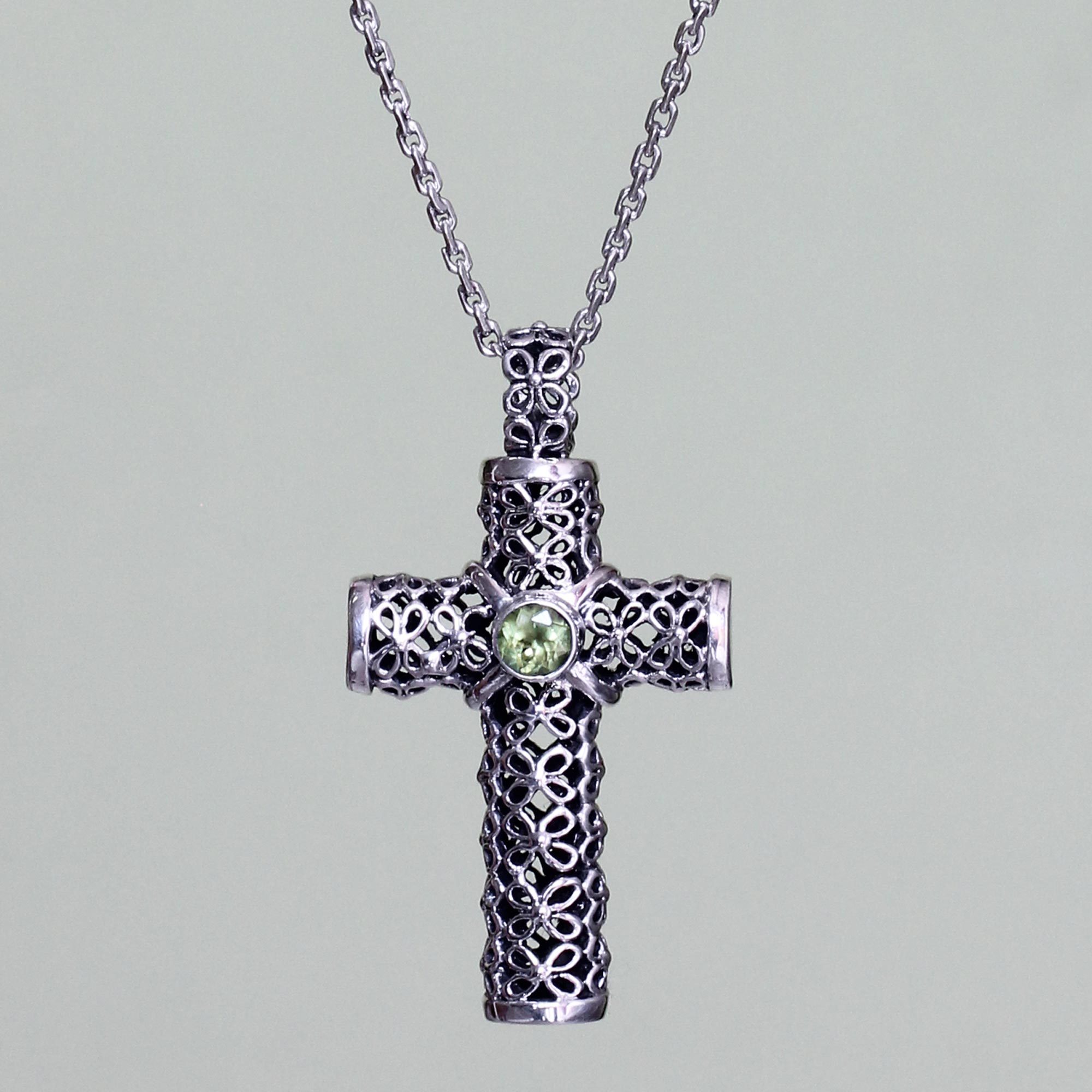 Woman's Sterling Silver Filigree and Peridot Cross Necklace , 'Royal Faith'