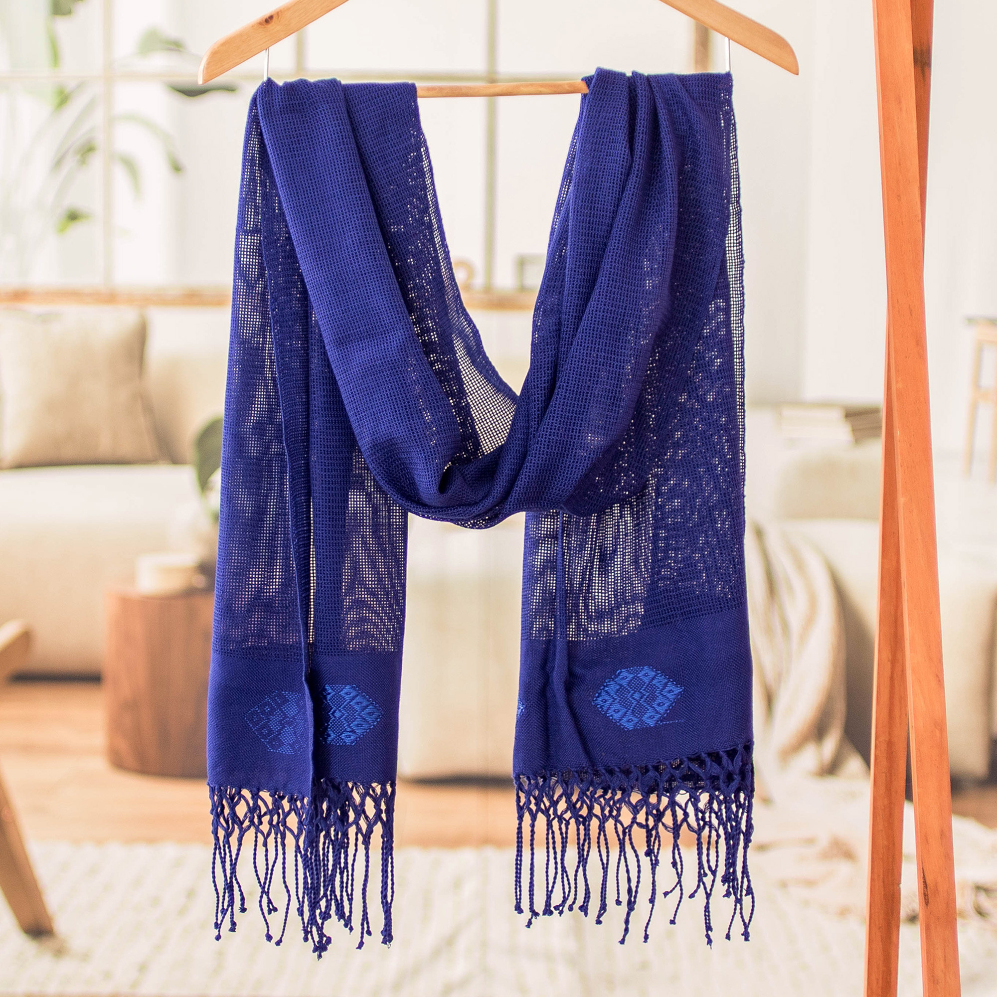 Embellish any outfit with this handcrafted wrap from Guatemala. Crafted by Nu'Kem Association of Textile Artisans this unique blue shawl was created on a hand loom and features a lovely hand-tied fringe. Jubilant fireworks are suggested by patterns along the border. This elegant shawl is sure to add a few memorable moments to your busy day.