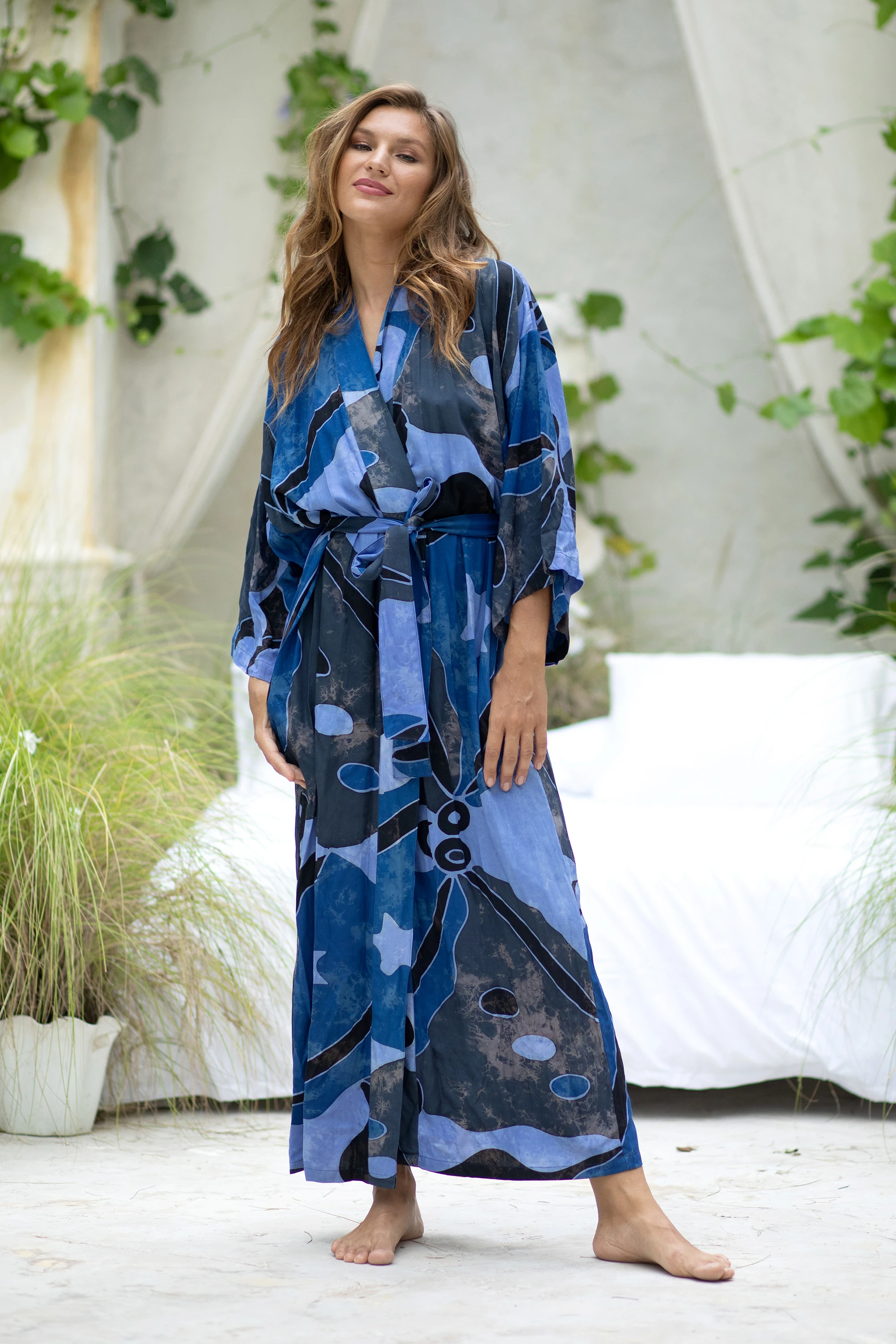 The magic of the sea breathes through exotic lagoons and midnight depths. By Nyoman Nadri, the colors of this batik work of art are given vibrant life through an intricate process of applying melted wax by hand before crumpling the fabric into a solution of dye. This technique is unique and complicated, creating individual works of art. No robe is ever exactly the same.
