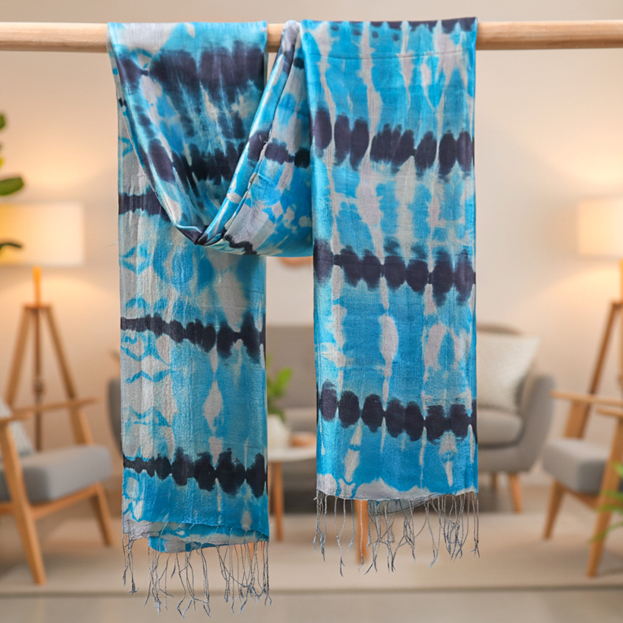Like a flowing river rippling with color, this breathtaking, silk shawl is a mix of lovely blue, turquoise and black shades. Designed by Vinita of Thailand, the original piece is handcrafted with tie-dye techniques to create wearable artwork.