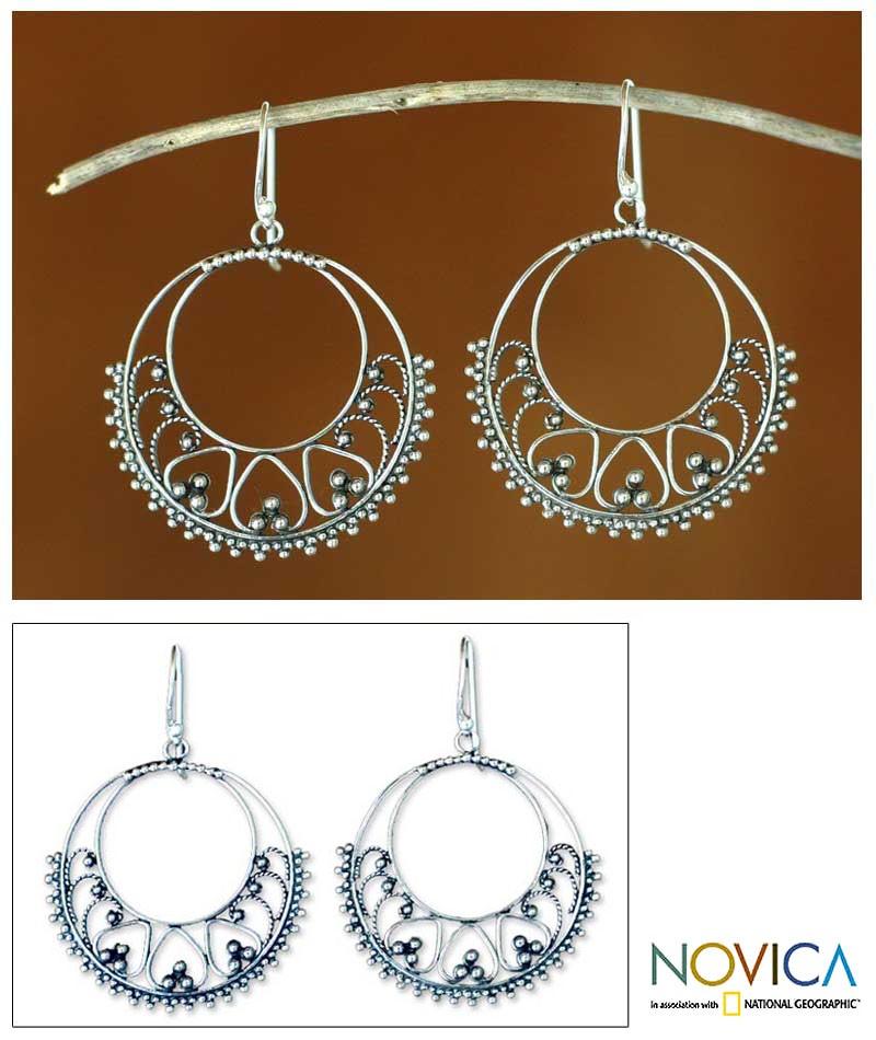Delicate and ornate, these earrings radiate the beauty of Balinese artistry. Expertly hand crafted with sterling silver, these dangle earrings are presented by Kadek Wijanegara of Indonesia. This pair of hoops are a perfect accent for a variety of looks.