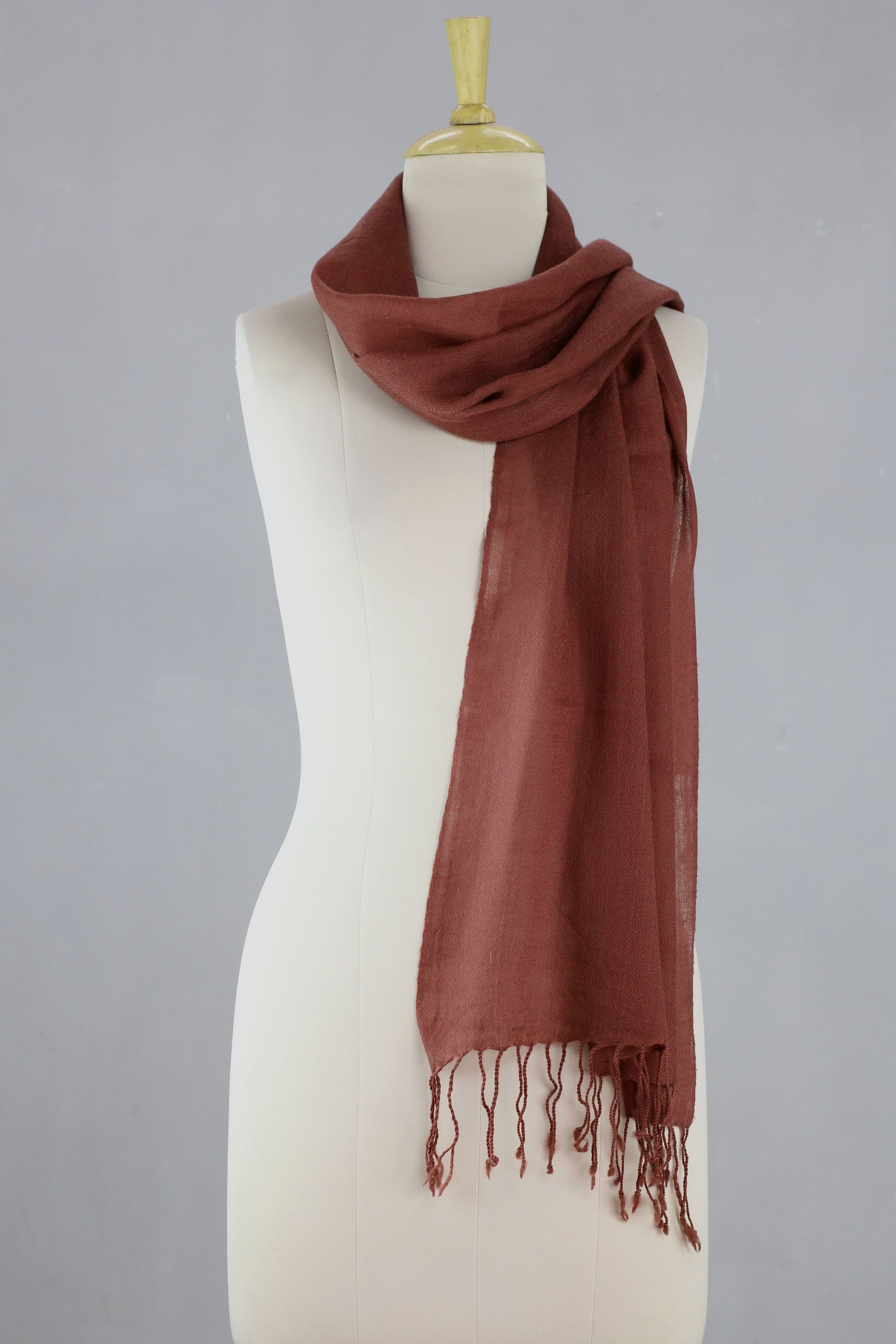 A warm and inviting chestnut hue defines this beautiful all-wool scarf from Indian artisan Sajad. The scarf is woven on a traditional hand loom in the classic Kashmiri chasm-e bulbul diamond pattern. The ends of the scarf culminate in hand-knotted fringe.