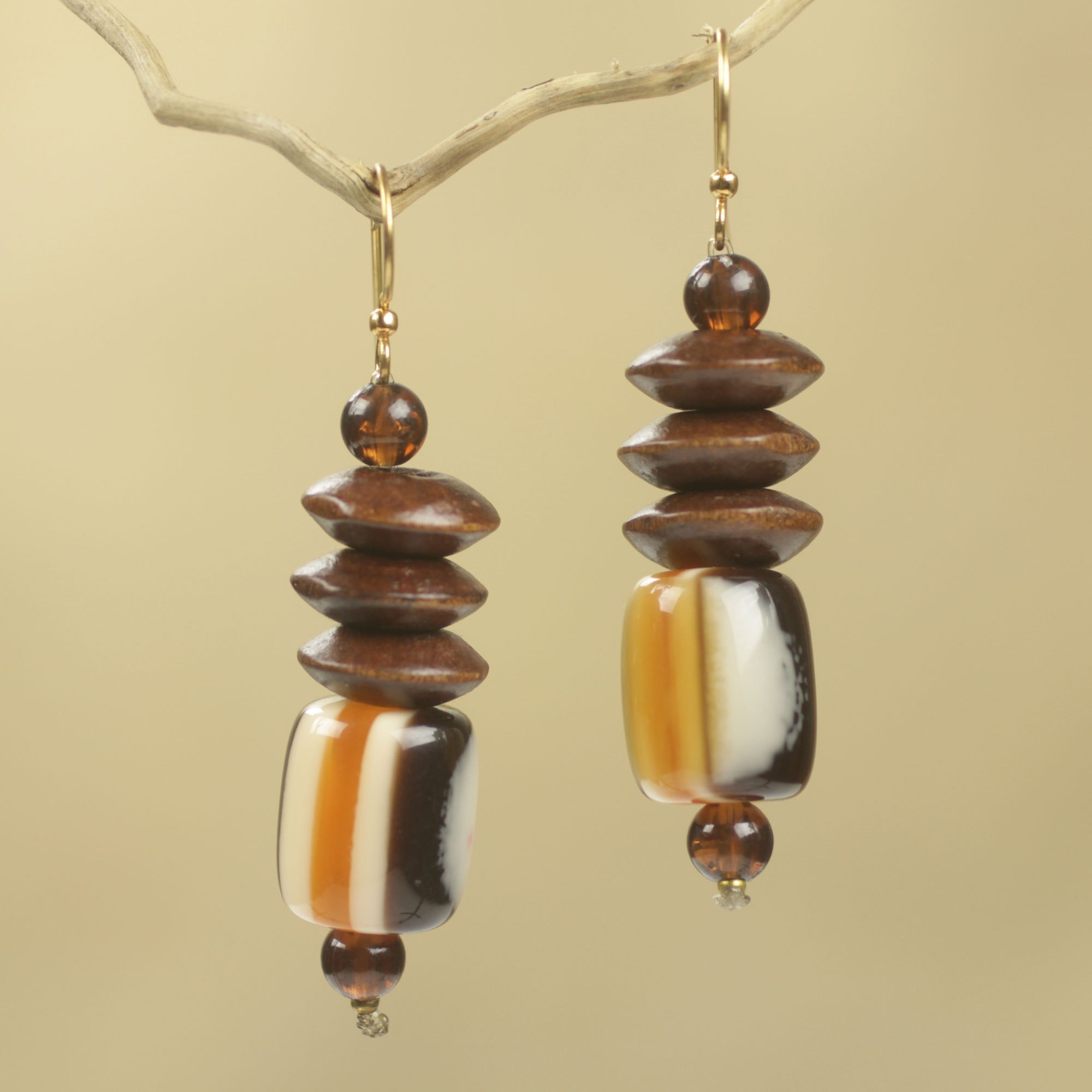 In warm shades of brown and cream, the "Edinam" earrings are designed to accessorize with a touch of eco-consciousness. Meaning "destiny provides" in the Ewe language, the earrings from Rita Addo Zakour are crafted by hand with sustainable sese wood and recycled plastic beads. The earrings are worn on brass hooks.