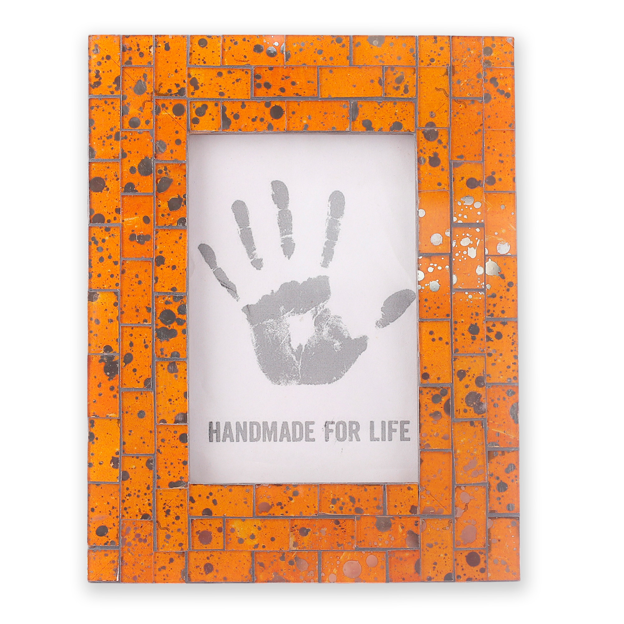 Return to those unforgettable days with a series of mosaics of warm colors—as warm as those moments you capture in a photo. Kamal's artisan team uses glass pieces on a wood structure to create this photo frame, embraced by little tiles in a tender orange hue.