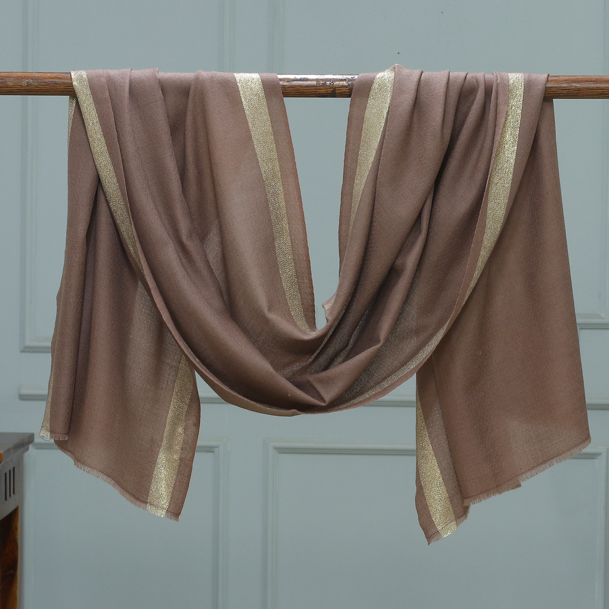 Sunlight dances across the metallic zari stripes adorning this elegant brown shawl, transforming an everyday accessory into a statement of refined luxury. The thoughtful wool and silk blend creates an exceptionally soft drape that moves gracefully with each step while providing natural temperature regulation. Indian artisan Shuja Ahmed's wrap offers practical versatility for year-round wear while showcasing generations of textile heritage in every precisely placed thread.