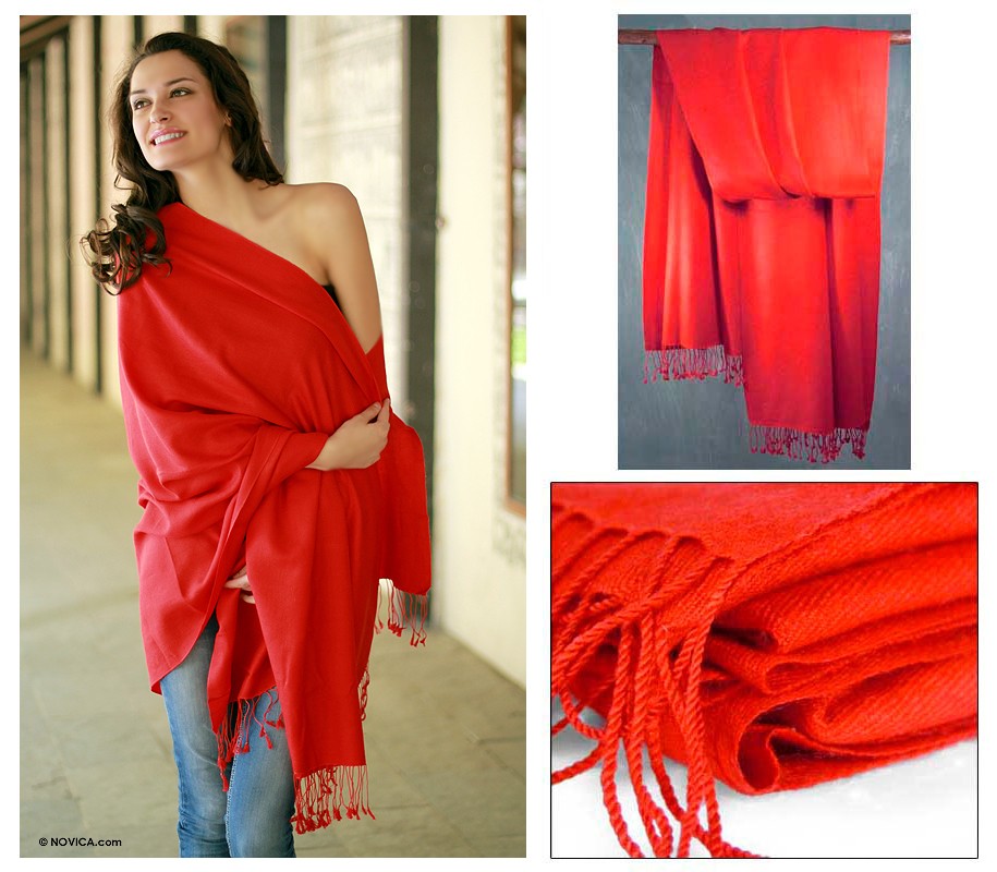 Wool Shawl Orange Red Wrap from India, 'Attraction'