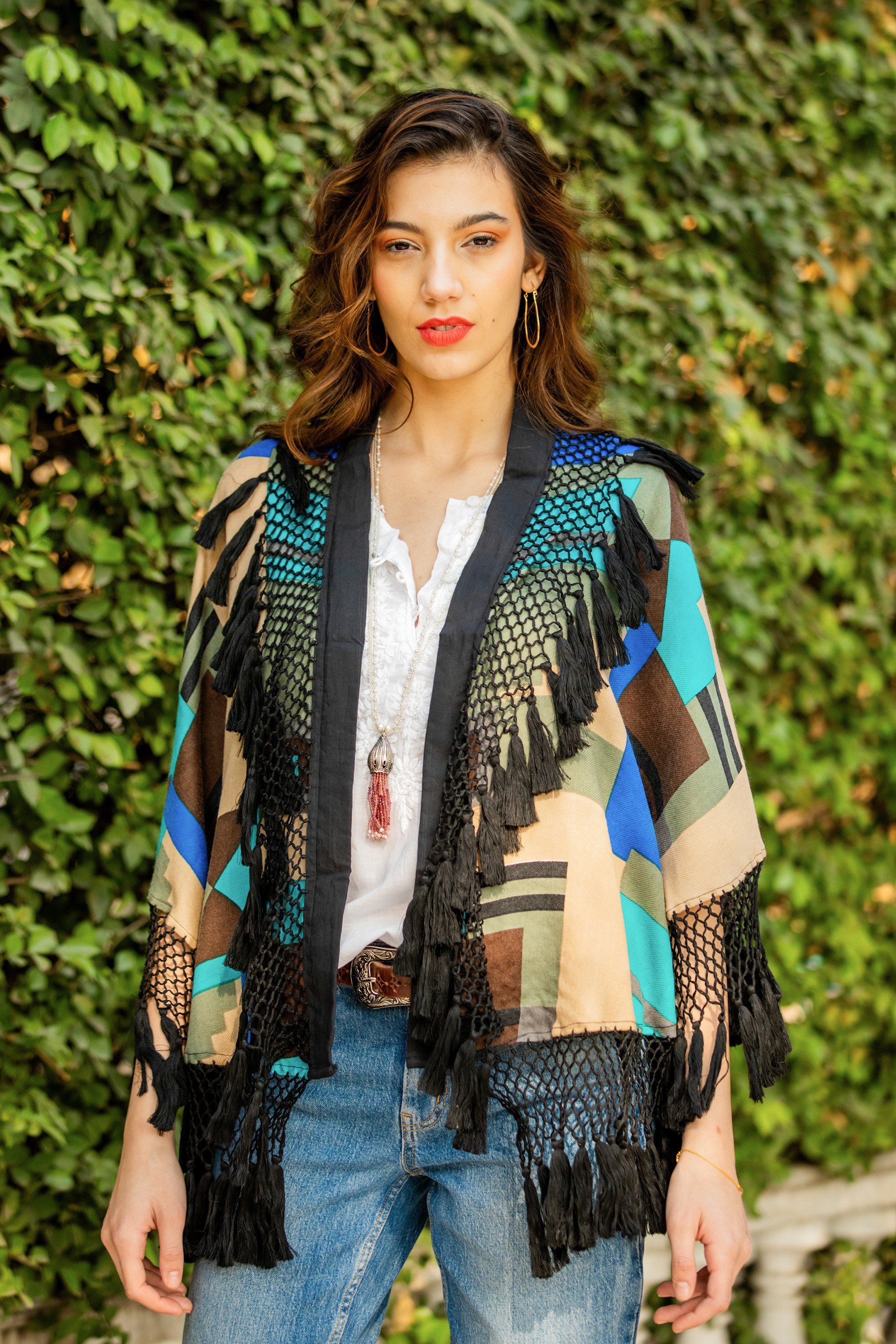 Cloak yourself in warmth and style wearing this bold wrap from India's Arnab Roy. Crafted from 100% wool, the wrap features a vivid geometric design screen printed in hues of ultramarine, turquoise, and beige. A black cotton macrame trim adorned with black tassels adds a playful yet elegant touch.