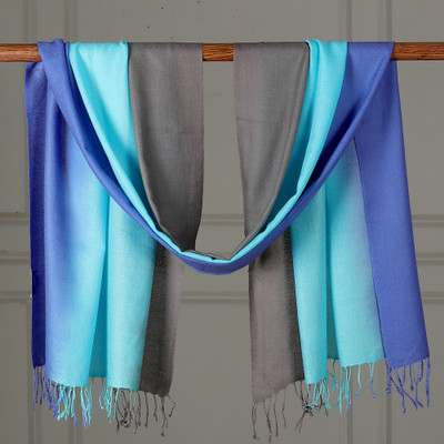 Soft wool textile assumes the colors of a paradisial sea in this shawl by India's Shahid. The artisan weaves the design in a palette of turquoise, iris and dark taupe hues, allowing you to charm the day with an ensemble that evokes serene waters. To ensure a chic look, fringes decorate each end.