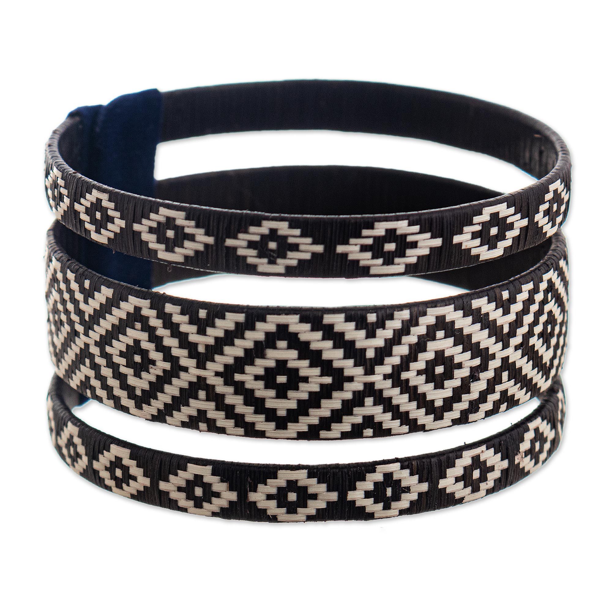 The Zenu, an ancient people in northwest Colombia, maintain a strong weaving tradition that is passed from generation to generation. The artisans of the Zenu Community create this marvelous cuff bracelet using PVC and native caña flecha fiber (a neotropical grass). The design of the wide espresso and ivory cuff creates the illusion of three bracelets rather than one.