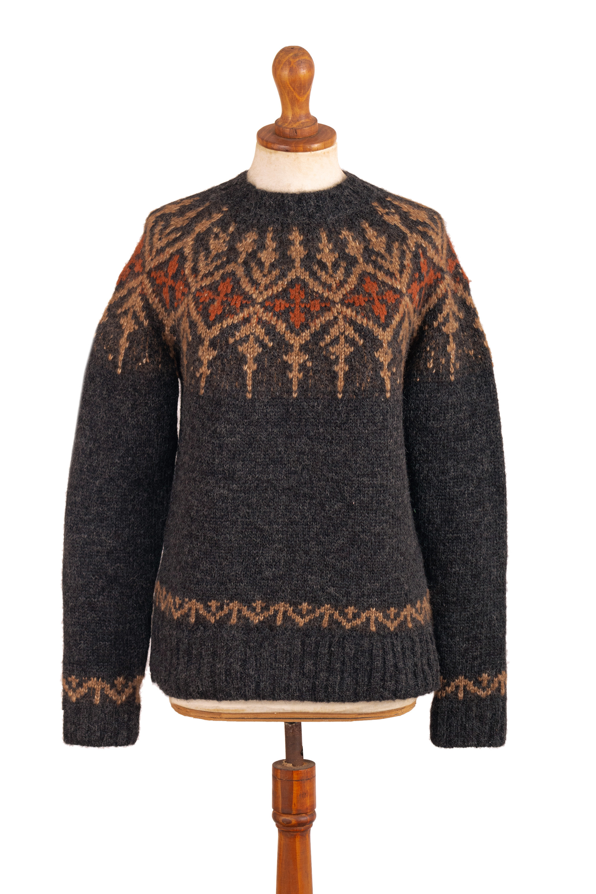 This cozy alpaca blend pullover by Benita Cutipa blends traditional textile artistry with laid-back, earthy style. In a soft heathered grey with accents of warm browns and sunset orange, it's the kind of sweater that feels like a favorite from the moment you slip it on. With long sleeves, a classic crew neck, and a relaxed fit, it's perfect for crisp mornings, golden hour strolls, and everything in between.