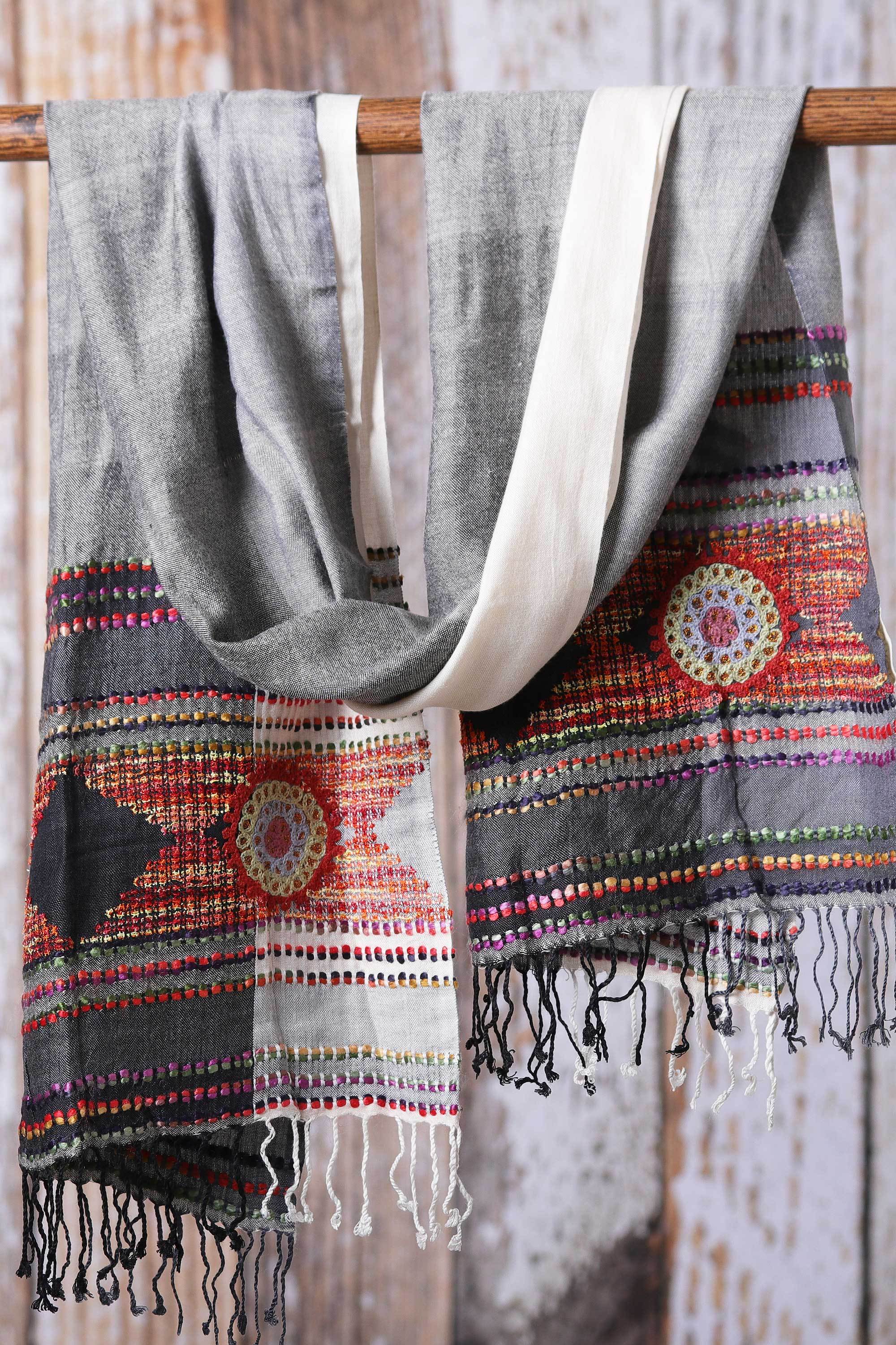 Woven Viscose Scarf with Embroidery in Grey White and Red, 'Timeless Splendor'