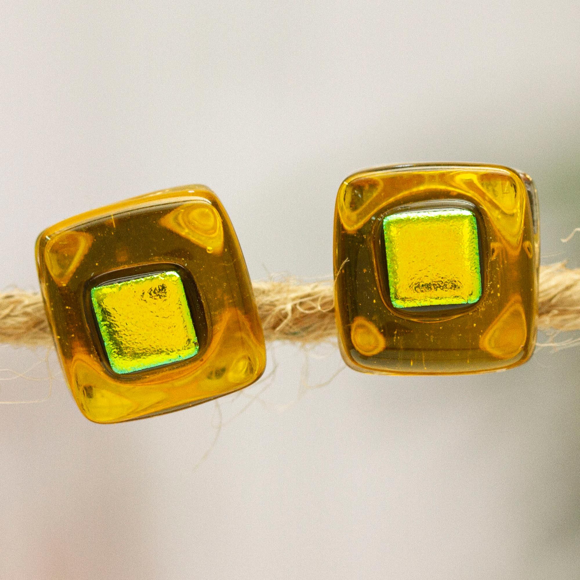 Yellow Fused Glass Mosaic Stud Earrings Handmade in Mexico, 'Yellow Dichroic'