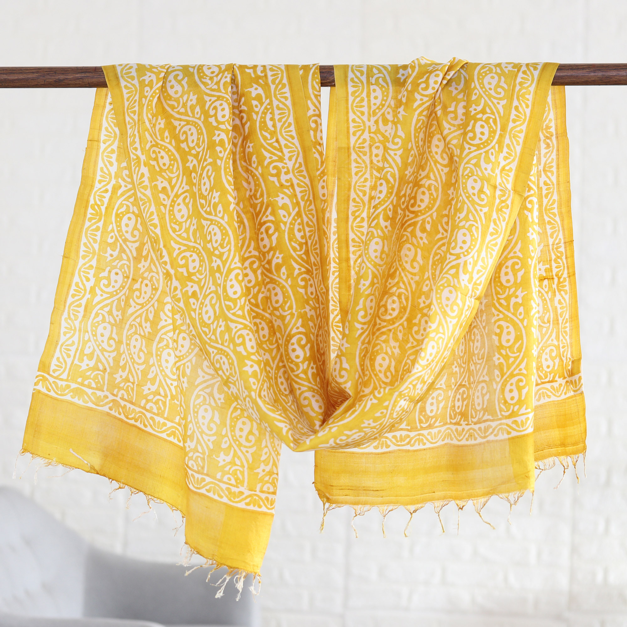 Yellow Silk Shawl with Hand-Block Printed Paisley Pattern, 'Sunny Paisley'